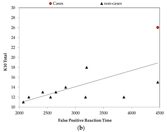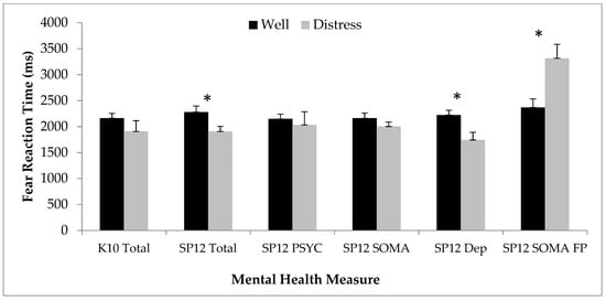 Mann–Whitney U Tests showed that youth whose SPHERE-12 Total scores indicated likelihood of a mental disorder had faster reaction times for fear expressions compared to non-distressed youth (p = 0.04; see Figure 2). With respect to the SPHERE-12 syndrome scales (PSYCH, SOMA, depression caseness; see Figure 2), Mann–Whitney U Tests indicated that there were no differences for the PSYCH syndrome scale between those who met threshold (N = 4; 10%) and those who did not. However, the SPHERE-12 Depression cases (N = 7; 17.5%) showed significantly faster reaction times for identification of fearful faces compared to non-depressed youth (p = 0.02) (Figure 2). Participants who met threshold for the SPHERE-12 SOMA syndrome (N = 7; 17.5%) had slower reactions time for false positives for fear faces compared to those who did not meet threshold. Mann–Whitney U Tests showed no differences in accuracy of fear recognition with respect to whether or not participants met criteria for likelihood of a mental disorder on the K10.