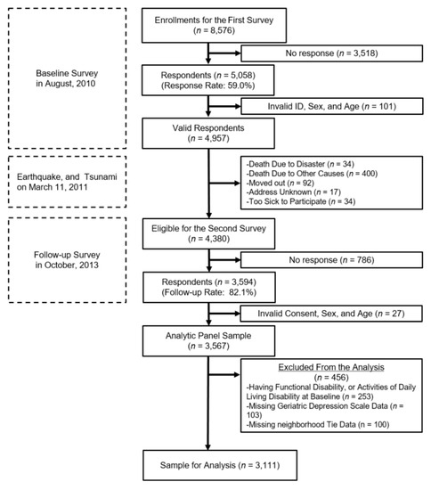 As most studies relating to mental health and disaster have employed cross-sectional or follow-up assessments about psychological health with post-disaster information [15,16,17], the association between the changes in the ties and psychological health using pre- and post-disaster information is unclear. Additionally, the association between social ties and psychological health has not been investigated focusing on older adults who form an increasing proportion of those exposed to natural disasters in this aging world [18,19]. Understanding the possible influence of the changes in the social ties during natural disasters on the psychological health among older survivors can potentially assist policymakers to prepare for future disasters.