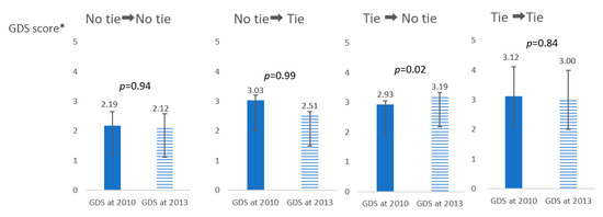 Among the individuals who had ties before the disaster, but had no ties after the disaster, mean GDS score increased from 2.93 points at 2010 to 3.19 points at 2013, although it was almost stable from 2.19 points at 2010 to 2.12 points at 2013 among those who had not had ties before and after the disaster (Figure 2).