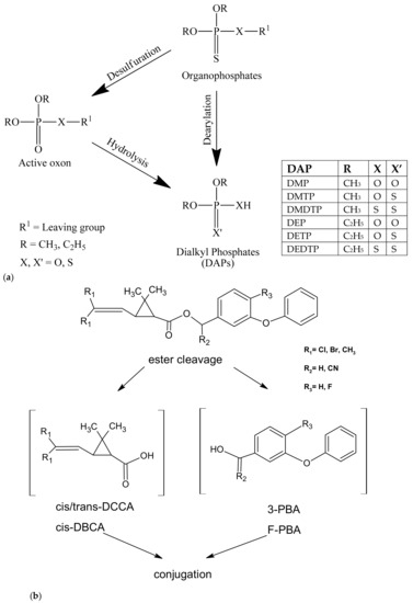 Metabolisms of (a) OPs and (b) PYRs and structures of metabolites measured in the study (adapted from [37]).