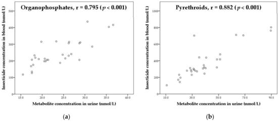 Correlation between insecticides in blood and metabolites in urine: (a) OPs and (b) PYRs.