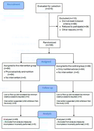 Samples were collected in the paediatric outpatient clinics of 12 health centres and endocrinology clinics at the Granada Hospital Complex. The study universe was composed of 521 children with overweight or obesity who attended the paediatrics and endocrinology clinics. For a 95% confidence level of p = 0.5 and a maximum estimation error of 10% a sample size of n = 54 was required for each group. The presence of overweight and obesity is defined as a body mass index (BMI = weight/height2 (g/m2)) greater than the cutoff values established by the International Obesity Task Force for age and sex, in children and adolescents [14]. In addition, body composition was measured using bioelectrical impedance. The sample allocation was randomised, following a probabilistic technique, without replacement, whereby each child who arrived at the health centre and met the inclusion criteria was assigned a ticket bearing a serial number, by the researcher responsible for recruitment. All these tickets were placed in a large container, from which the principal investigator of the clinical trial extracted 54, which were assigned to the intervention group (IG). The following 54 numbers were assigned to the control group (CG). Inclusion Criteria: Obese children that want participate in a voluntary way in the research and sign the informed consent. Exclusion Criteria: Refused to participate, hormonal problems, age <8 or >12 years, orthopaedic problems, respiratory problems and other problems.