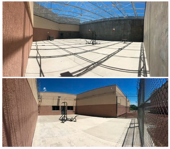Coconino County Detention Facility offers recreation time to individuals housed in minimum to maximum security dorms. Recreation time is not always offered in jail facilities and is described by the jail administration as a privilege offered to everyone by Coconino County Detention Facility. Each of the four pods have their own recreation area (space dedicated for recreation time) with a concrete floor and equipped with a bolted down piece of exercise equipment (Figure 1). Larger recreation areas have a toilet and picnic table. One recreation area that is available to juveniles housed at Coconino County Detention facility is also equipped with basketball hoops. To note, incarcerated adults are not allowed access to basketballs; however, individuals are offered a handball for use during recreation time. Each dorm is allocated prespecified, scheduled recreation times one hour per day, five times per week. Individuals from different dorms are not allowed to be at recreation time together.