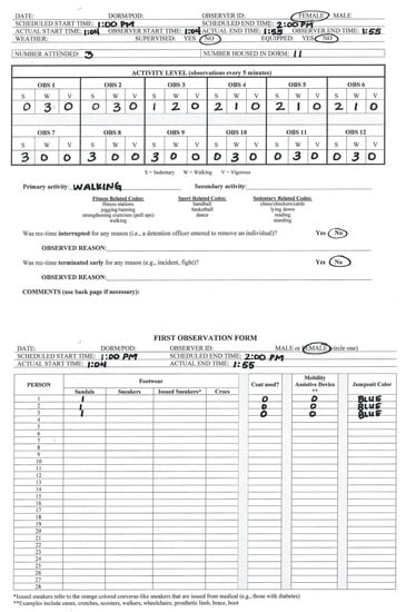 Changes made to the SOPARC observation form were also necessary. For use during recreation time in the Coconino County Detention Facility, researchers removed the “conditions for target areas” as it was not applicable to the jail setting. The recreation areas inside the jail are controlled environments, and recreation time occurs in the same location, at the same times, each day. “Ethnicity” and “age group” information was also removed from the form and protocol as both may be unreliable measures through observation. Activity-related codes (e.g., basketball, soccer) were also removed from the form, as adults participating in recreation time are not allowed these types of activities.