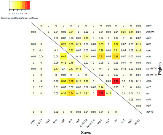 Statistical association between VGs of the E. coli isolates derived from piglets (the part above the diagonal) and sows (the part under the diagonal). No values were introduced in the case of undetected genes.