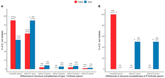 Frequency of the gene combinations within the structure of (A) type 1 and (B) P fimbriae operons among the E. coli isolates from piglets and sows. Note: The gene combinations within the structure of type 1 fimbriae operon: Complete operon: fimB-fimE-fimA-fimI-fimC-fimH; Without 1 gene: fimB-fimE-fimI-fimC-fimH; Without 2 genes: fimB-fimI-fimC-fimH, fimB-fimE-fimC-fimH, fimE-fimI-fimC-fimH; Without 3 genes: fimB-fimC-fimH, fimB-fimA-fimH, fimI-fimC-fimH, fimB-fimE-fimH; Without 4 genes: fimB-fimH, fimC-fimH, fimI-fimH; Without 5 genes: fimH. The gene combinations within the structure of P fimbriae operon: Complete operon: papAH-papC-papEF-papG; Without 1 gene: papAH-papC-papEF; Without 2 genes: papAH-papC. * Statistically significant.
