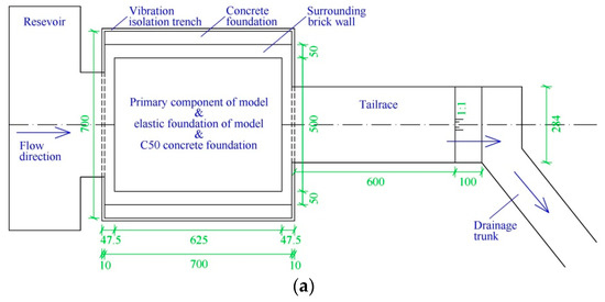 In order to avoid the interferences of background noise, pump operation, vehicle vibration, and other experiments in the laboratory with respect to the acceleration signal, the vibration isolation system was designed and was applied in this hydro-elastic model. The original soil below the XHS model was excavated and replaced by C50 concrete, and the concrete foundation was 7 m long, 7 m wide, and 1.5 m deep. The elastic foundation made of high-density rubber was then constructed above this concrete foundation (shown in Figure 4b). Moreover, four open trenches (0.1 m wide and 1.5 m deep) were arranged around the concrete foundation to cut off the lateral vibration transmission path. In addition, flexible connections made of a relatively soft water-tight rubber belt were used to connect the hydro-elastic model with the upstream reservoir, as well as the hydro-elastic model with the downstream tailrace. In this case, the hydro-elastic model was constructed on a rigid concrete foundation, and the vibration propagation paths above and below ground were cut off by the flexible connections and open trenches, respectively. Thus, the interferences of external vibration and noise could be effectively eliminated. In Figure 8, the vibration isolation system is illustrated.