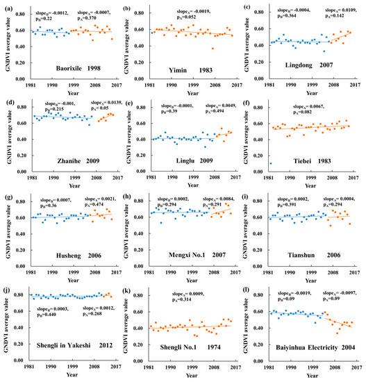 Figure 3 shows the GNDVI before and after mining in 25 large-scale mining areas from 1982 to 2015. In Hulunbuir, for Baorixile, vegetation coverage showed insignificant slope values of decrease at −0.0012 per year (p = 0.22) and −0.0007 per year (p = 0.370) before and after mining (Figure 3a). For Yimin, there was an insignificant decrease trend of vegetation coverage with the slope value of −0.0019 per year (p = 0.052) after mining (Figure 3b). In terms of Lingdong and Linglu, an insignificant decrease trend was found in vegetation coverage with their slope values of −0.0004 per year (p = 0.364) and −0.001 per year (p = 0.39) before mining, but an insignificant increase trend was seen in vegetation coverage with their slope values of 0.0109 per year (p = 0.142) and 0.0049 per year (p = 0.494) after mining (Figure 3c,e). For Zhanihe, vegetation coverage had a significant increasing tendency after mining (Figure 3d), with the slope value of 0.0139 per year (p < 0.05). For Tiebei, vegetation coverage exhibited an insignificant slope value of increase at 0.0067 per year (p = 0.082) (Figure 3f). In terms of Husheng, Mengxi No. 1, Tianshun, and Shengli in Yakeshi, there was an insignificant increasing trend of vegetation coverage with their slope values above 0 per year before and after mining (Figure 3g–j). In Xilingol, for shengli No. 1, vegetation coverage presented an insignificant increasing tendency (Figure 3k), with the slope value of 0.0009 per year (p = 0.314) after mining. In terms of Baiyinhua Electricity, Baiyinhua No. 1, and Baiyinhua Haizhou, an insignificant decreasing tendency was found in vegetation coverage with their slope values below 0 per year before and after mining (Figure 3l,o,p). For Shenglidong No. 2, vegetation coverage showed an insignificant slope values of increase at 0.0011 per year (p = 0.371) and 0.0063 per year (p = 0.352) before and after mining (Figure 3n). For Baiyinhua No. 3, Baiyinhua No. 4 Phase Ⅱ, and Duolun, vegetation coverage presented an insignificant slope values of decrease below 0 per year before mining, but increase above 0 per year after mining (Figure 3m,q,r). In Tongliao, for Huolinhe No. 1 and Zhahanao’er, a significant decreasing tendency was found in vegetation coverage with their p-values below 0.05 after mining (Figure 3s,t: slope = −0.0019 and −0.0095). For Jinyuanli, there was an opposite changing trend in vegetation coverage before and after mining, and the changing trends were insignificant (Figure 3u). In Chifeng, for Yuanbaoshan, Laogongyingzi, and Liujia, vegetation coverage showed an insignificant slope values of decrease after mining, with their slope values below 0 (Figure 3v,x,y: p = 0.067, 0.139 and 0.171). For Fengshuigou, a significant increasing tendency was seen in vegetation coverage after mining (Figure 3w: slope = 0.0013, p < 0.05).