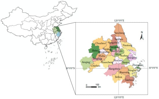 Flood, a kind of sudden natural disaster with the characteristics of high frequency and huge loss, is closely related to other disasters, which can transfer to each other and produce a chain reaction of disasters. At present, there is no unified definition of flood [1]. It brings losses and misfortunes to people’s normal life and production activities, which are called flood disasters [2]. It has social attributes, and it is dependent on human society [3]. About two-thirds of the land area has imparity in types and degrees of flood disasters in China, and the direct economic loss caused by flood disasters accounts for about 62% of the total economic loss of various natural disasters every year [4]. Furthermore, 70% of China’s big cities and 50% of its population are located in the eastern and coastal areas. Among them, the YRD region is one of the most serious flood-prone areas, with a severe flood disaster occurring every one or two years on average [5]. Flood disasters have been on the rise in recent years and still will be a serious threat to urban sustainable development [6].