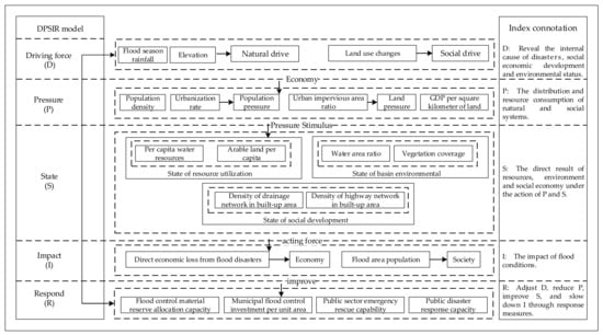 Urban flood disaster is a typical complex social system problem with multiple influential factors. Many factors, such as social and economic factors, environmental conditions, land planning, water and climate changes, have complex and profound influences on the probability of occurrence and consequences of urban flood disaster; the mutual influence mechanism is random and inevitable [42]. Climate changes make the analysis of these extreme events more complicated [43]. There used to be no uniform standard for quantitative research on factors affecting flood disaster, and the selection criteria of risk assessment index systems were also inconclusive [44]. To address this complexity and improve flood risk analysis methods, the organization for economic cooperation and development [45] introduced the pressure, state, response (PSR) method, then constructed a layered framework of environmental assessment indexes to describe the relationships among human activities, resources, the environment and institutional management. The early PSR framework focused excessively on environmental issues and neglected other development elements such as society, economy and institutions. There is not a one-to-one correspondence between the pressure and state, and complex social networks relationships cannot be fully revealed by a simple chain. Based on the existing problems of PSR frameworks, the European Environment Agency (EEA) first proposed the DPSIR framework when studying the relationship between environmental degradation and agriculture [46]. The DPSIR is a multifactor comprehensive conceptual evaluation model based on PSR, which is widely used in environmental system evaluation [47]. The driving force refers to the elements that directly contribute to the development of events. By separating the influence from the state, we can more intuitively understand the effect of the changing state on the “impact”. Therefore, the DPSIR framework (Figure 2) was established to analyze the causal relationship among society, economy, environment and resources in urban flood disaster system. Attempts to quantify complex problems and then implement the data-driven integration and multidimension evaluation method can provide a realistic basis for more effective evaluation results [48].