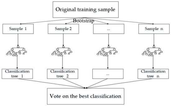 As we explore more sophisticated data structures, we can come up with explanations that are closer to the real world. The feature selection is the process of retaining the most effective features from the original data, and the accuracy of data classification is higher after screening [49]. At present, the selection methods of this characteristic subset mainly include the analytic hierarchy process (AHP), Pearson correlation, entropy weight method and regularization, among other algorithms. However, the RF algorithm is one of the most accurate models for classification prediction [50]. The RF is composed of a decision tree and a Bagging algorithm. As a multiclassifier algorithm based on ensemble learning, it makes full use of the concept of single classifier and sampling statistics to solve the problem of insufficient precision of a single classifier. Compared with other methods, the RF has less generalization errors and higher accuracy, which makes it suitable for solving problems without prior knowledge or with nonlinear multivariable constraints and incomplete data [51]. The steps of the RF algorithm are shown in Figure 3.