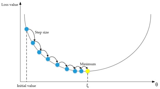 The key dilemma of the RBF network is the selection of the center parameters of hidden layer neurons. This is generally valued in random selection or k-means clustering method. The optimization methods include gradient descent method, Newton’s method and conjugate gradient method; the gradient descent method has the highest accuracy and is widely used. The basic function center was determined by the gradient descent method in this paper, and then the function center and distance were modified continuously, as shown in Figure 4. is the model parameter, and is the model optimal parameter.