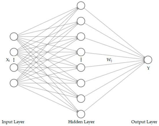 where represents the number of nodes in the hidden layer, and is the weight of each neural node. The hidden layer has higher dimensions in most cases, and the output layer realizes linear output through activation function. The structure of the RBF is revealed in Figure 5, including input layer, hidden layer and output layer.