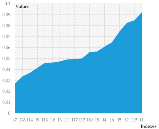 According to Figure 6, it can be deduced that the critical indexes are rainfall, municipal flood control investment per unit area, elevation and urban impervious area ratio. On the contrary, the importance of flood area population, reserve and distribution capacity of flood control materials and per capita water resource are relatively low, accounting for less than 10%. Urban flood disaster id affected by the population and the reserve and distribution capacity of flood control materials also, which resulted in low impact on actual flood disaster risk. Therefore, these three indexes were eliminated and the top 15 indexes were employed as the input matrix of the RBF network.