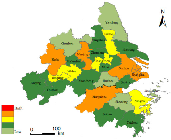 The above analysis showed that the level of urban flood disaster is closely related to rainfall, topography, economic development, land use, urban flood control investment and disaster emergency response capability. The practice and experience have proved that the single concept of flood prevention can no longer adapt to the complex social environment. The concept of modern flood management is an important part of the improvement of water resources management planning and implementation within the basin, which needs to coordinate the formulation of policies and strategies at the national, river basin, provincial and sub-river basin levels [65]. The Netherlands, Mexico and other countries are actively exploring new models of multilevel integrated flood management [66,67]. The flood control should adhere to the concept of multiscenario, multidimensional and multifactor coordinated development of the society–economy–ecology. Based on the evaluation results of flood risk in the YRD region, this paper discusses how to reduce flood risk in the YRD region from three aspects: improving urban infrastructure, developing regional ecological economy and strengthening emergency response to disaster prevention and relief.