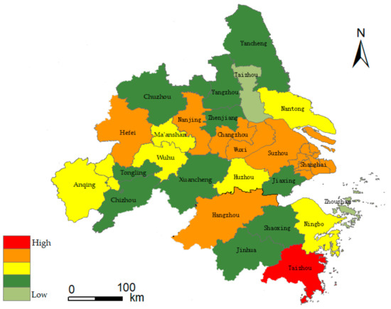 According to the urban region scale, with the rise of Nanjing metropolitan region, Hangzhou metropolitan region, Hefei metropolitan region, Suzhou–Wuxi–Changzhou metropolitan region and Ningbo metropolitan region, the flood disaster risk of urban agglomeration in the YRD region has formed a “multicenter” spatial distribution. From the flood risk diagram, the flood risk level expresses a descended distribution trend from the center area of the metropolitan to the periphery. The flood risk level in the Suzhou–Wuxi–Changzhou region of the Taihu basin has increased rapidly in a short time, which has aroused concern for the overall ecological security of this region. The urban agglomeration in Anhui section of the Yangtze River still has a large space for urbanization in the near future, and urban flood risk control is also an urgent problem to be solved in this development. Although the risk of flood factors is relatively high in the south zone of the YRD, there is no high-grade flood risk, which is consistent with the research results of Ge et al. [64].