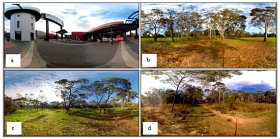 - Similar spatial configurations (i.e., open yet defined environments with “relatively smooth ground texture and trees that help define the depth of the scene” [25] (p. 48)). Although the ground is less smooth in the high biodiversity scene, it is still traversable. The role of “trees” as a spatial element in the urban environment is filled by a tower and tall columns.