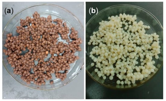 A volume of 1 mL of acetic acid was placed into a 100 mL volumetric flask and diluted with ultrapure water to obtain a 1% (by volume) acetic acid solution. Then, 2 g of chitosan was dissolved in the acetic acid solution to obtain a 2% (by weight) chitosan-acetic acid solution. Biochar (2 g) and BiFeO3 (2 g) were added to the solution at 25 °C and magnetically stirred until homogeneous. The resulting mixed solution was slowly dropped with a syringe into a 1% NaOH solution to form chitosan gel beads with a uniform particle size. After standing for 4 h, the chitosan gel beads were removed from the solution and washed, then placed in 400 mL of deionized water, and 5 mL of a glutaraldehyde aqueous solution was added. After adjusting the pH to 9.0, the mixture was slowly stirred at 60 °C for 2 h to induce cross-linking and finally allowed to stand for 20 h. The beads were removed and washed to neutral to obtain the final crosslinked chitosan-loaded BiFeO3/biochar composite. The above steps were repeated without adding biochar or BiFeO3 to make blank beads. The obtained finished products are shown in Figure 1.