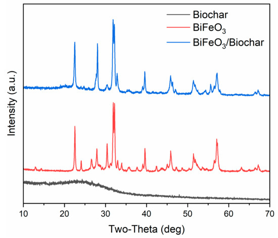 Figure 2 shows the XRD patterns of the biochar, BiFeO3, and BiFeO3/biochar coupled magnetic material. For BiFeO3, the major peaks assigned to the (012), (104), (110), (006), (202), (024), (116), (122), (018), (202), (214), (300), (208), and (220) planes indicated planar BiFeO3 with a single-phase perovskite structure (JCPDS No. 20-169) [27,34]. The biochar exhibited a broad diffraction peak near 24°, which suggested that it contained amorphous carbon [35]. In the XRD pattern of the BiFeO3/biochar coupled magnetic material, the main peaks for biochar and BiFeO3 were observed, and it was confirmed that the synthesized BiFeO3/biochar coupled magnetic material contained different amounts of biochar and BiFeO3.