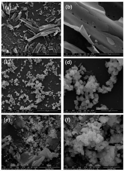 Scanning electron microscopy images of (a,b) biochar, (c,d) BiFeO3, and (e,f) BiFeO3/biochar coupled magnetic material.