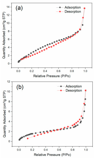 Nitrogen adsorption–desorption isotherms of (a) BiFeO3 and (b) BiFeO3/biochar.