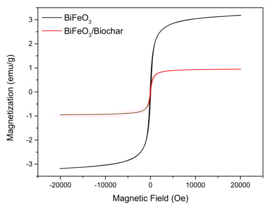 In order to study the magnetic properties, the magnetization hysteresis curves of the BiFeO3 and BiFeO3/biochar-coupled magnetic material were measured by vibrating sample magnetometry (Figure 6). The hysteresis loops are sigmoid curves. The saturation magnetization (Ms), coercive force (Hc), and remanence (Mr) of BiFeO3 were 3.18 emu·g−1, 78.36 Oe, and 0.31 emu·g−1, respectively, and those of the BiFeO3/biochar coupled magnetic material were 0.95 emu·g−1, 43.21 Oe, and 0.08 emu·g−1, respectively. The remanence of both samples was very small (close to zero), indicating that the magnetization almost disappeared when the external magnetic field was removed. The BiFeO3 and BiFeO3/biochar coupled magnetic material exhibit superparamagnetism at 25 °C, which is important for convenient recycling of these composites [42,43]. After completion of the adsorption process, the BiFeO3/biochar coupled magnetic material can be collected and separated from the aqueous solution using a magnet.