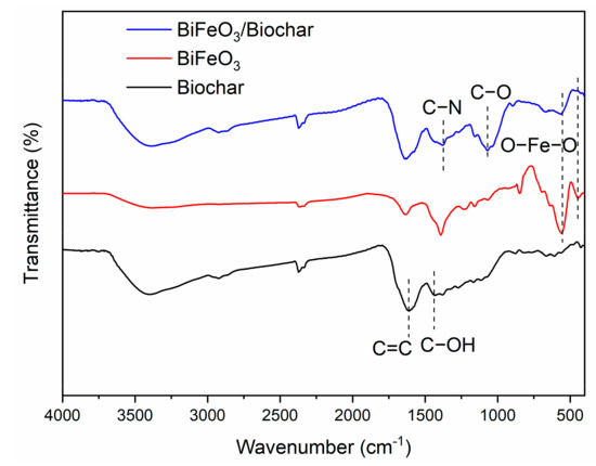 Fourier transform infrared spectra of biochar, BiFeO3, and BiFeO3/biochar magnetic material.