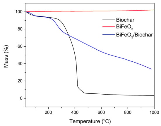 The results of the TG analysis of biochar, BiFeO3, and BiFeO3/biochar coupled magnetic material are shown in Figure 8. Under an air atmosphere and heating to 1000 °C, the biochar lost approximately 96.79% of its total mass. The mass reduction by 4.89% in the interval of 25–120 °C is mainly due to the dehydration process [44]. When the temperature was gradually increased from 120 °C to 500 °C, the mass of the biochar was significantly reduced by 88.48% owing to destruction of the biochar structure. No significant mass loss was observed for BiFeO3. The mass loss of the BiFeO3/biochar coupled magnetic material at 1000 °C represents 66.25% of its total mass.