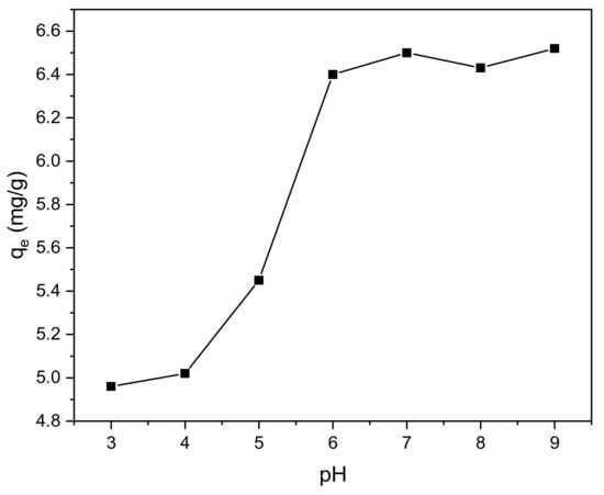 The effect of pH change on adsorption is shown in Figure 9, illustrating that the adsorption and removal rate of methylene blue by the BiFeO3/biochar coupled magnetic beads were affected by pH. The adsorption increased with increasing pH. When the pH of the reaction solution was raised from 3.0 to 6.0, the adsorption amount and removal rate were markedly improved. When the pH was further raised from 6.0 to 9.0, the changes observed in the adsorption and removal rate were not as significant.