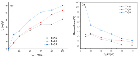 The effects of initial methylene blue concentration C0 and reaction temperature on adsorption are shown in Figure 11. The adsorption of methylene blue using the modified biochar was affected by the temperature at which the reaction was carried out, where the adsorption amount and the removal rate were higher at higher temperatures. Based on Figure 11, as C0 increased, the concentration of methylene blue adsorbed also increased; however, the removal rate decreased.