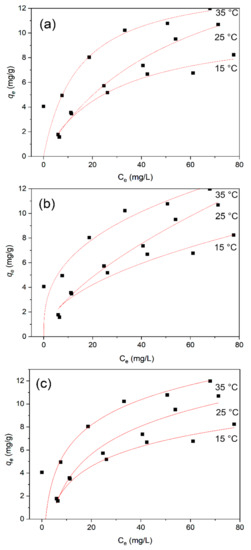 where qe is the amount of adsorbed methylene blue (mg·g−1); qmax is the maximum adsorption amount (mg·g−1); KL is the Langmuir adsorption constant (L·mg−1), which is related to the affinity of the adsorption sites; Ce is the concentration measured at the end of the adsorption reaction (mg·L−1); KF is the unit capacity constant of the Freundlich model (L·mg−1); n is the Freundlich constant related to the adsorption strength; R is the ideal gas constant with a value of 8.314 × 10−3 kJ·mol−1·K−1; T is the absolute temperature (K); and aT (L·g−1) and bT (kJ·mol−1) are the Temkin constants. The relevant parameters obtained from the three adsorption isotherms fitted with the Langmuir, Freundlich, and Temkin models are given in Table 1.