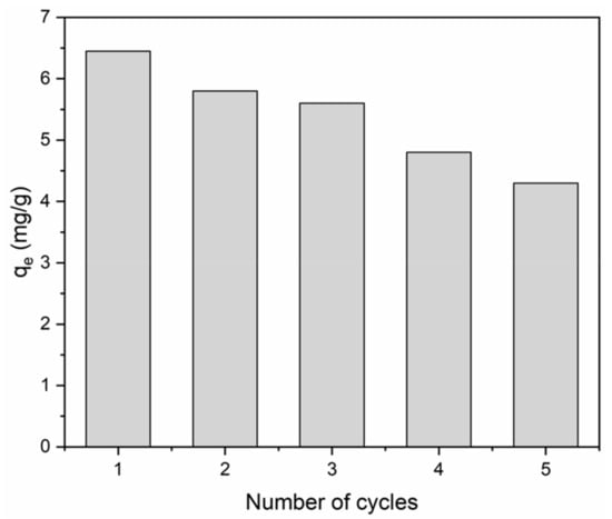 In order to test the regeneration and reuse capability of the BiFeO3/biochar coupled magnetic material, a 1.0 mol·L−1 CH3COOH solution was used to desorb the adsorbed methylene blue. Then, the regenerated BiFeO3/biochar coupled magnetic material was washed to neutral and reused for further adsorption experiments.