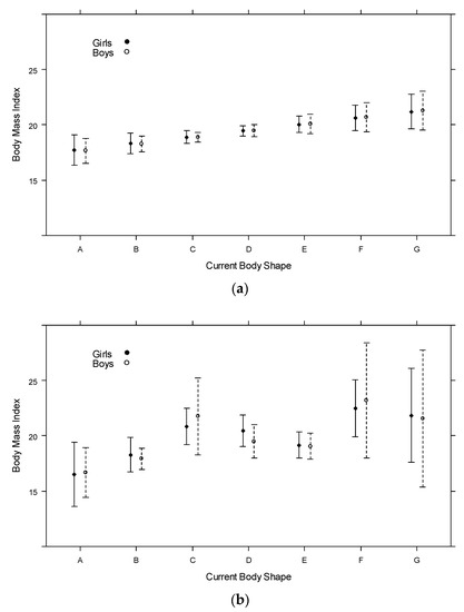 Figure 1b); however, locally, we observed a slight decrease in predicted BMI between categories C, D, and E. This observation was not expected, and seems counter-intuitive. A linear relationship exists; it seems that young adolescents with BMIs slightly higher than the average tended to choose category C, which depicted a somewhat thin physique, and that, inversely, those with a somewhat lower BMI chose category E, showing a somewhat bigger body. Again, the predicted values for boys and girls are similar, and the decline in predicted BMI values between C, D, and E is observed in both genders.