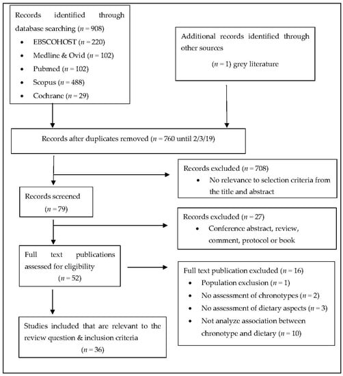 All studies that reported an association between chronotype and dietary aspects, irrespective of study design (except for letters to the editor and conference proceedings with abstract only), were eligible for this review. However, this scoping review only included studies that were conducted among adults (more than 18 years old) and assessed the circadian rhythm phase as a chronotype. Studies conducted among animals or among individuals with a sleep disorder, mental illness, depression, bipolar disorder, and blind individuals were all excluded.