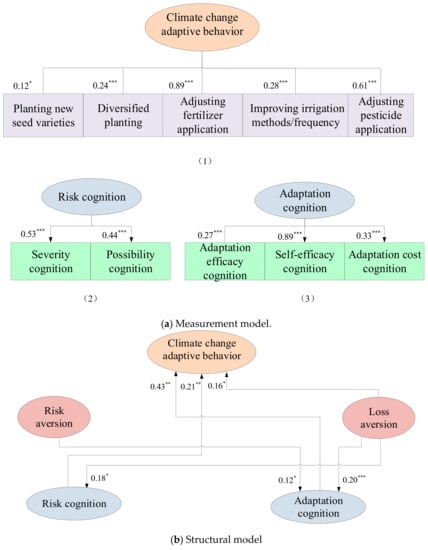 The latent variable of adaptation cognition consists of three indicators: adaptive efficacy cognition, self-efficacy cognition and adaption cost cognition. The factor relationship coefficients of the three factors for adaptation cognition were 0.27, 0.89 and 0.33, respectively, which means that self-efficacy cognition has the strongest explanation power, followed by the adaptation cost cognition and the self-efficacy cognition. This finding is in line with previous research. Farmers would take adaptation actions only when they feel capable of coping with the risk [36]. Uncertainties regarding the effectiveness of adaptation measures can impede the adaptation efforts. Moreover, adaptation cost is also an important factor influencing farmers’ adaptation decisions. Programs that would lower farmers’ adaptation cost could be launched to improve farmers’ adaptive ability.