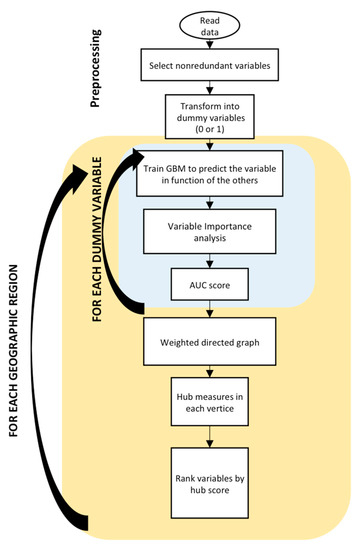 A flowchart illustrating the general procedure is shown in Figure 1. First, the PeNSE dataset was loaded and preprocessed, as described in the Data Preprocessing section. Then, the dataset was split according to Brazil’s five geopolitical regions, which are well-established spatial clusters of the country (North, Northeast, Central-West, South, and Southeast). These five regions are well-established in Brazil, since they have several heterogeneous features (sociodemographic, economics, ethnicity, climate, natural resources, etc.). Thus, the results of our analyses could potentially be highly different among these five regions. For each region, a predictive model for a chosen target variable was built based on GBM, using the other variables as predictors. For each predictive model, the importance of the predictor variables (from the training data) and area under the receiver-operating characteristic curve (AUC of test data) was then calculated. A directed weighted graph (network) was modeled based on the yielded variables importance. Then, graph analyses were applied to identify the main hubs of this network (i.e., the main potential confounders). Finally, the similarity of the findings across the five regions was investigated.
