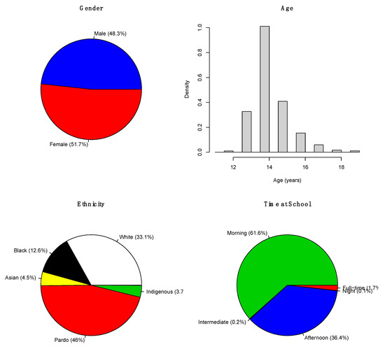 The PeNSE survey entails questions about socioeconomic aspects, family context, eating habits, physical activity practice, experimentation and consumption of cigarettes, alcohol and other drugs, sexual and reproductive health, violence, safety, accidents, and use of health services [9]. The 2015 edition was approved by the National Research Ethics Commission (CONEP), which regulates and approves health research involving human beings in the country (no. 1006467). In Brazil, the Child and Adolescent Statute (ECA, Law No. 8.069, of 13 July 1999) requires surveys to have clear objectives and to subsidize policies to protect and provide autonomy to adolescents to take initiatives, such as answering questionnaires. Therefore, students were not obliged to answer sensitive questions and there were no risks to their health. Measures were taken to protect the subject´s identity, to avoid embarrassment, and to make them feel comfortable.