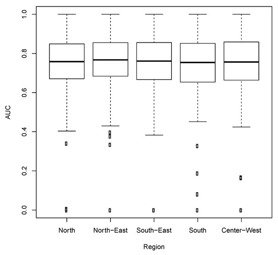 Boxplot for the area-under-the-curve (ROC) across variables for each geographic region.