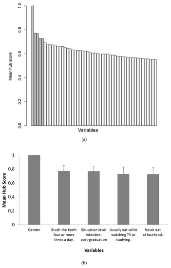 Thus, analogous to the oral health conditions and gender, the nutrition variables are also a proxy for many other variables. It is important to mention that the results were obtained in a completely data-driven approach. Moreover, Figure 3, Figure 4 and Figure 5 emphasize that the hub centrality rank is replicable across the five-country regions with slight differences, thus, these findings seem to be robust and not obtained by chance.