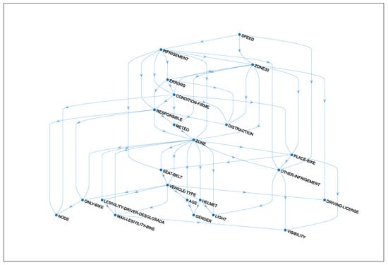 As a result, the learning is divided in two phases: structural and parametric. First, the DAG is obtained by applying the greedy learning algorithm proposed by Buntine [28]. This is a score-based algorithm that tries to obtain the DAG corresponding to the lowest Bayesian Information Criterium (BIC) which is a measure of the goodness of fit of a Bayesian model based on the likelihood function that penalizes the complexity of the model to avoid overfitting (See Schwarz [29] and Wit [30] for detailed explanation of the score definition). To this aim, for each step the algorithm evaluates all the possible links between the variables introducing the DAG with lowest BIC that best represent the independencies of the data. Please note that we have not included a minimum improvement threshold to add new links to the graph due to the penalty term of the BIC, limiting the inclusion of new links. Other algorithms introduce a pre-order of the variables (K2-algorithm, [31]) limiting the possible parents of a particular variables in order to reduce the computational costs but introducing a dependence on the order established, so we decided discard this option. Secondly, the parameters given by the DAG are obtained by maximum likelihood as the ones that better explain the observed data. Note that the DAG doesn’t reflect causality but the statistical dependences between the variables, and from a mathematical point of view an equivalent factorization can be obtained keeping the non-directed graph and the v-structures relating three variables (e.g., Age → Gender ← Helmet), but it is not necessary to maintain the direction of the links between variables [31].