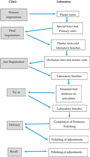Ethical approval was obtained from the Human Research Ethics Committee of the institution (clearance certificate M170604). Patients who attended the clinic were asked to provide informed consent for swabbing of each stage for the fabrication of new complete dentures. Patients who had existing oral pathologies were not included in this study. Due to multiple reasons, although 16 patients participated in this study, only 5 patients were followed through from the commencement of fabrication to the end stage of denture construction. The study design is given in Figure 1 and the different stages of denture production are shown in Figure 2.