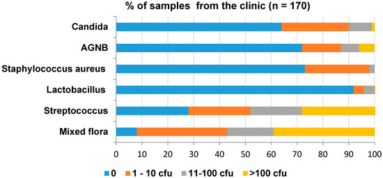 Detailed microbiological results of the laboratory study are shown in Table S2 of the Supplementary Materials. The least amount of Lactobacilli was found in the dental laboratory. The plaster room bench used for impressions was heavily contaminated with mixed flora. In addition, it contained S. aureus and AGNB. The pumice areas and the brushes were also heavily contaminated with mixed flora and contained Lactobacilli, AGNB and Candida. The grinding wheel was contaminated with mixed flora and mostly AGNB. Ten percent of the dental laboratory benches were contaminated with S. aureus, AGNB and Candida of up to 100 cfu.