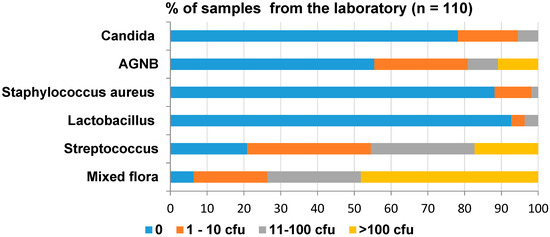 The overall level of contamination is shown in Figure 3. The most prevalent contaminant was Streptococci and the least was Lactobacilli. Although Candida was present in 36% of the samples, the quantities were low (1% of samples with >100 cfu/swab).