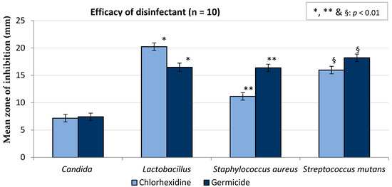Results of the in vitro study on CHX and Germicide showed that the zones of inhibition were similar for C. albicans (p > 0.99), whereas CHX performed better than Germicide for lactobacilli (p < 0.01). The mean zone of inhibition of Germicide was greater with S. aureus and S. mutans compared with CHX (Figure 5). Overall, the mean zone of inhibition of Germicide (14.6 ± 0.4 mm) was significantly higher than CHX (13.6 ± 0.3 mm), with a p value of 0.002.