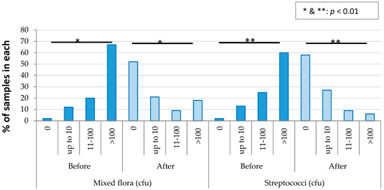 The results of the mixed flora and Streptococci were further analysed to assess the reduction in the number of organisms due to the disinfection. The results are shown in Figure 6. The number of other organisms was not compared due to the small sample size after disinfection. Disinfection significantly reduced the number of mixed flora and Streptococci.