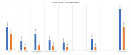 They were significantly more likely to report sensitive skin (54.3% vs 31.0%), particularly very sensitive skin (18.7 vs 6%, p < 0.0001), sensitive eyes (53.9% vs 25.7%, p < 0.00006), and having parents with sensitive skin (33% vs 17.7%, p < 0.0001). Notably, 24.7% of those who reported allergies also reported having atopic dermatitis during childhood compared to only 9.9% in those who did not report any allergies (p < 0.00001).
