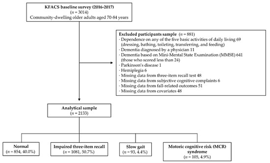 The Korean Frailty and Aging Cohort Study (KFACS) is an ongoing prospective cohort study to investigate the frailty status of older Korean adults [23]. The KFACS recruited 3014 community-dwelling older adults aged 70–84 years from 10 nationwide centers, including rural, suburban, and urban areas, in a 2-year comprehensive baseline survey. Among the participants of the KFACS, those who were dependent in any of the basic activities of daily living (ADL) (n = 69), self-reported a diagnosis of dementia (n = 11), or scored < 24 points in the Mini-Mental State Examination (MMSE; n = 641) [24], and had a history of Parkinson’s disease (n = 1) or hemiplegia (n = 6), were excluded from the present study. In addition, those who had missing 3IR test scores (n = 48), a question about SCCs (n = 6), and fall-related outcomes (n = 51) and covariates (n = 48), were excluded. On the result, a total of 2133 older adults were selected for the present study (Figure 1). The Clinical Research Ethics Committee of Kyung Hee University Hospital approved the KFACS protocol (Institutional Review Board [IRB] number: 2015-12-103). The present study was exempt from the requirement for IRB approval by the Clinical Research Ethics Committee of the Kyung Hee University Medical Center (IRB No.: 2020–03–073).
