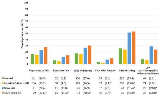 The prevalence of fall-related outcomes according to MCR status using 3IR. The numbers and percentages of outcomes are presented as n (%). * p < 0.0063.