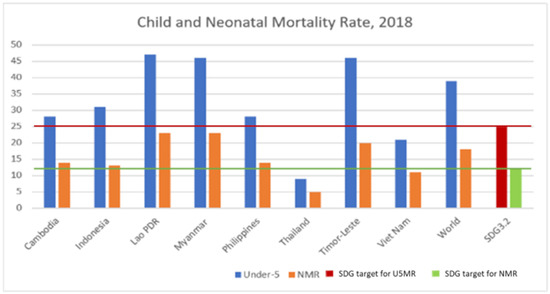 - UNICEF; World Bank Group, United Nations. Child and neonatal mortality per 1000 live births 2018, selected countries in East Asia and Pacific. In Levels and Trends in Child Mortality; UNICEF: Bangkok, Tailand, 2019. [Google Scholar]