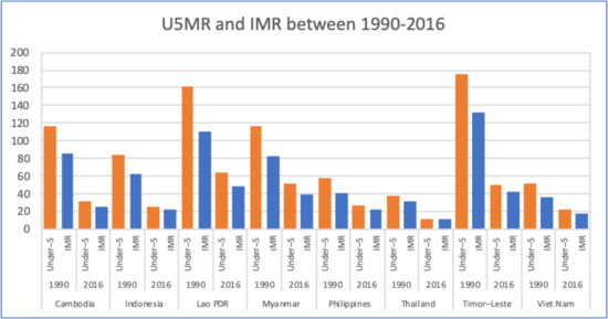 Under-5 mortality and infant mortality rate in 1990 and 2016 of selected countries in the South East Asia region. Data source: Levels and trends in child mortality 2019, UNICEF, WHO, World Bank Group and United Nations [11].